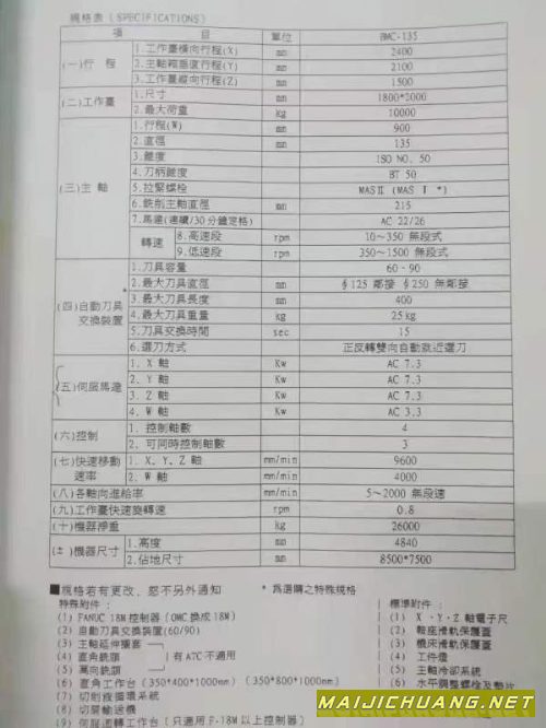 台湾远东数控镗铣床BMC-135,远东130,BT50主轴带齿轮箱,千分之一度,工作台mm,承重10000KG,X轴行程2400mm,Y轴行程2100mm,Z轴行程1500mm,W轴行程900mm,60把刀库,发那科系统,三轴硬轨,三轴带光栅尺。