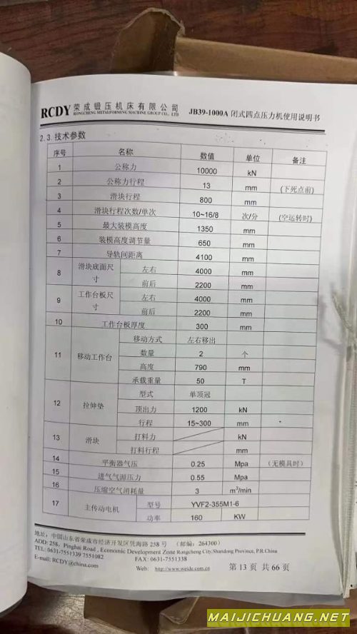 合肥锻压1000吨压力机滑块行程:1300mm.