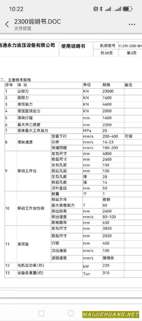 南通锻压产2500吨7液压机,数据见图,.